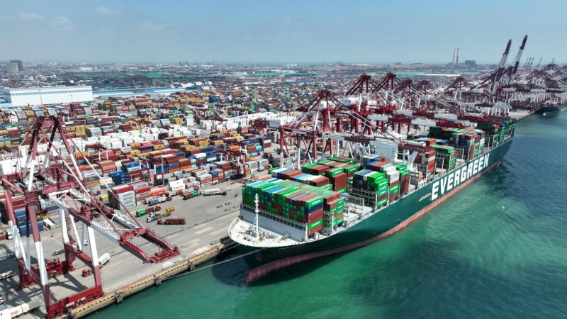 繁忙航線:平均每?jī)煞昼娋陀薪鸫u國(guó)家貨物裝卸的青島港。(6月15日攝,無(wú)人機(jī)照片)。新華社記者李紫恒攝