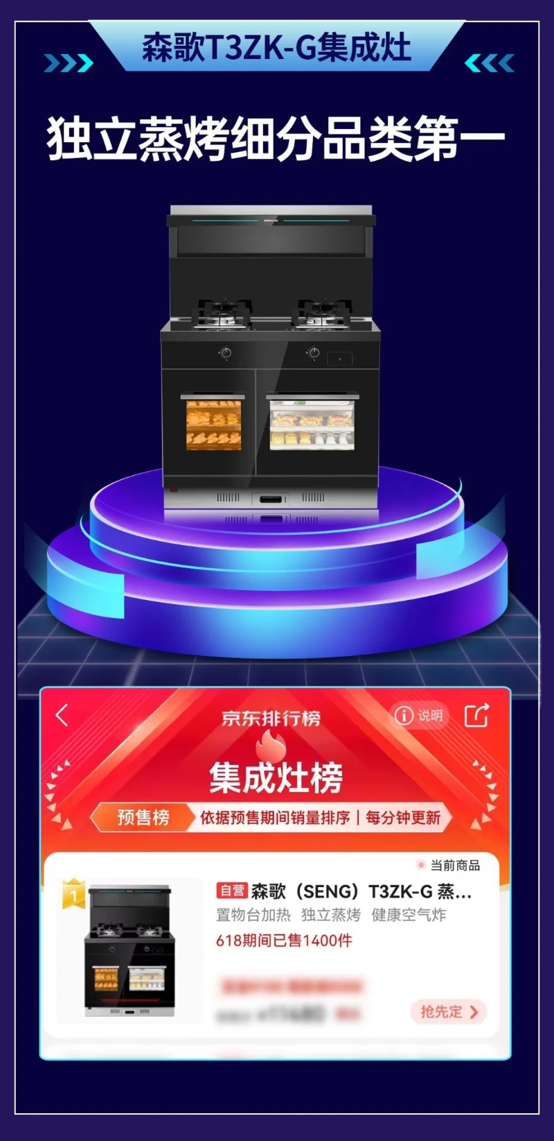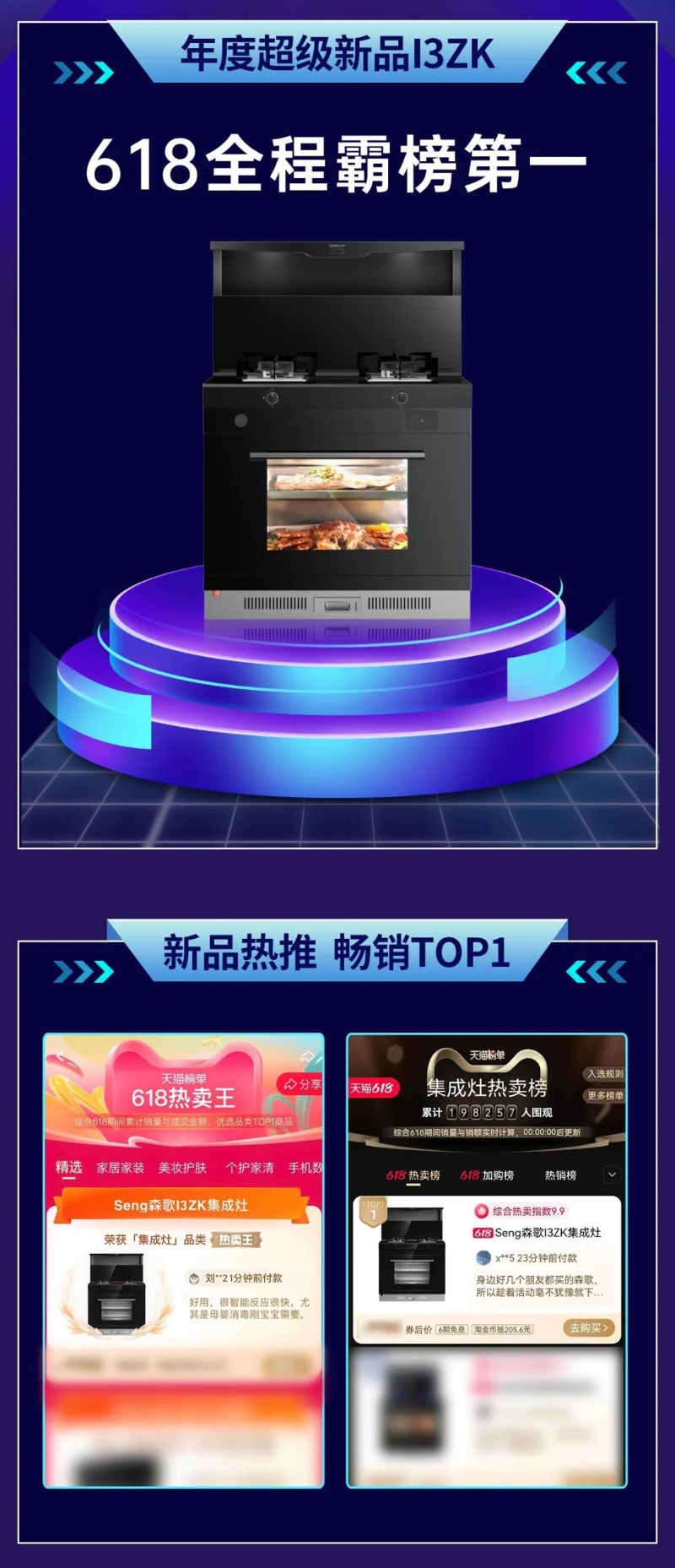自3月上市以來,i3蒸烤消一體款已連續(xù)3個(gè)月穩(wěn)居集成灶品類銷售榜第一。在這次的618大促活動(dòng)中,i3ZK再次將戰(zhàn)績(jī)榜刷新高度,在618預(yù)售中預(yù)售榜第一、618全程霸榜熱賣榜第一。同時(shí),i3ZK助力森歌旗艦店拿下大牌家電第一、廚房大店行業(yè)店鋪第一,618開門紅單品、店鋪第一,雙料冠軍。