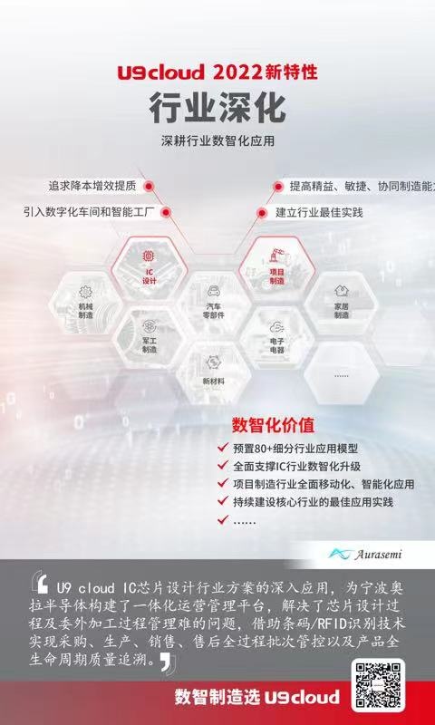 在行業(yè)深化應(yīng)用層面,U9 cloud一直堅持聚焦行業(yè)、持續(xù)深耕,并重點聚焦機械制造、電子電器、汽車零部件、家居制造、軍工制造的離散制造行業(yè)。比如,針對當(dāng)前國家重點扶持的以芯片為代表的IC行業(yè)和裝備制造行業(yè),U9 cloud通過對IC行業(yè)、裝備制造行業(yè)數(shù)智化轉(zhuǎn)型需求和趨勢研究,已經(jīng)快速開發(fā)出具有行業(yè)特色的應(yīng)用插件。