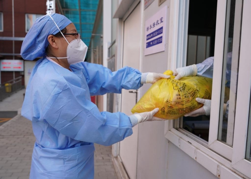 5月25日,在北京市上地醫(yī)院,護師將取回的隔離酒店人員的核酸樣本交給樣本接收室醫(yī)務人員。新華社記者 任超 攝