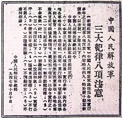 1947年10月10日,《人民日?qǐng)?bào)》刊發(fā)《中國(guó)人民解放軍總部關(guān)于重新頒布三大紀(jì)律八項(xiàng)注意的訓(xùn)令》。
