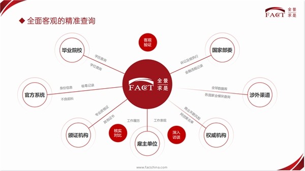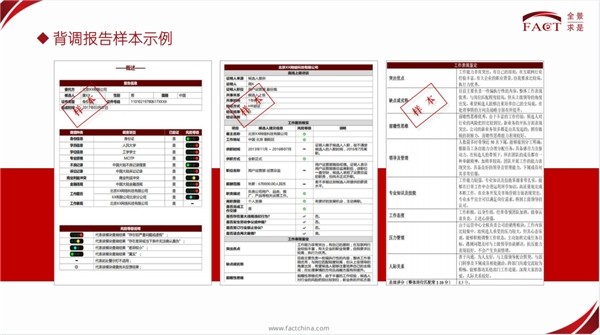 如何保證背調(diào)的真實性,同樣成為了用人企業(yè)關(guān)注的重點問題。與企業(yè)HR背調(diào)和獵頭背調(diào)不同的是,專業(yè)的第三方背調(diào)機構(gòu)擁有合法合規(guī)的征信資質(zhì),可通過官方授權(quán)的信息采集渠道進行個人信息、不良記錄等信息的收集。區(qū)別于互聯(lián)網(wǎng)秒查背調(diào),全景求是不僅擁有穩(wěn)定的線上查詢渠道,且具有完善的線下信息獲取方式和專業(yè)的背景核查團隊,在核實候選人提供的證明人信息的同時,自主尋找對應(yīng)證明人了解更多信息,做好交叉對比。通過人工核查的方式,獲取候選人最準(zhǔn)確最真實的離職時間、離職原因、職位職稱、崗位職責(zé)、薪酬水平等信息;并且與候選人前雇主的HR、直系上級、同事、下屬以及合作伙伴等證明人進行有關(guān)候選人工作表現(xiàn)的訪談,定制訪談問答機制,采用深挖、追問等專業(yè)方法,獲得更有價值的反饋結(jié)果。通過多元細(xì)致的調(diào)查內(nèi)容,對候選人信息及工作能力進行專業(yè)評估,判定調(diào)查結(jié)果的問題嚴(yán)重等級,為企業(yè)提供決策指引。