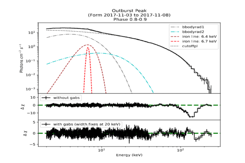 “慧眼”衛(wèi)星在146千電子伏附近觀測(cè)到超亮X射線源Swift J0243.6+6124的基頻電子回旋吸收線。(中科院高能物理研究所供圖)