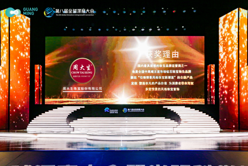7月4日晚,第八屆全球深商大會暨光明科學城大會開幕式在深圳隆重舉行。在頒獎盛典上,周大生珠寶喜獲第十二屆“深圳老字號”殊榮。