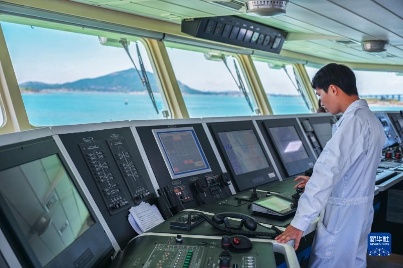 7月10日,“海巡06”輪船員在平潭海事監(jiān)管基地的“海巡06”輪上操控儀器設(shè)備。 新華社記者 周義 攝