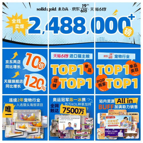 Solid Gold素力高通過一系列活動(dòng),一舉引爆618狂歡熱潮。不僅作為寵物行業(yè)唯一品牌連續(xù)兩年入選“貓頭海報(bào)”項(xiàng)目,站內(nèi)站外強(qiáng)勢霸屏,快速深入Z世代圈層。此外,還聯(lián)合奧運(yùn)冠軍陳一冰微博發(fā)起話題,攜小紅書、抖音多平臺百萬KOL種草,傳遞輕松喂養(yǎng)理念,曝光量超7500萬。同時(shí),Solid Gold素力高打造618直播活動(dòng),健合集團(tuán)素力高中國區(qū)執(zhí)行總裁丁雯(Niki)還親臨直播間,作為“首席福利官”撒福利,創(chuàng)新線上直播引爆效能,千萬流量助推品牌銷售雙豐收。Solid Gold素力高不斷在中國線上、線下渠道同步拓展,以高端品質(zhì)搶占中國寵物市場新機(jī)遇。