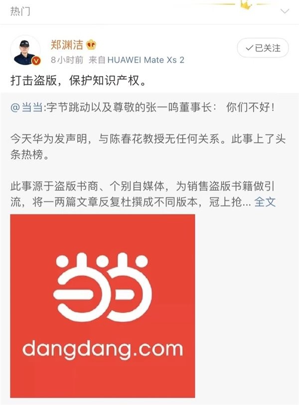 近日,“華為與陳春花”事件沖上今日頭條熱榜榜首,引發(fā)網(wǎng)友熱議。隨著此事件的持續(xù)發(fā)酵也牽扯出盜版書(shū)產(chǎn)業(yè)鏈問(wèn)題。盜版書(shū)籍的出現(xiàn)不僅嚴(yán)重破壞出版市場(chǎng)版權(quán)秩序,還侵害了讀者的權(quán)益。作為圖書(shū)電商平臺(tái)的當(dāng)當(dāng)網(wǎng),在微博呼吁,電商平臺(tái)不應(yīng)被盜版書(shū)商所淹沒(méi),要以技術(shù)抵制盜版。