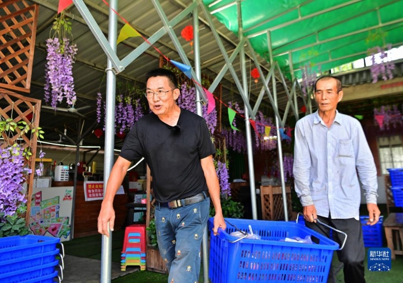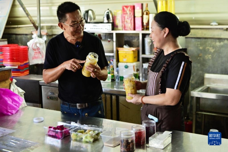 7月11日,在位于廈門市翔安區(qū)的榮杰園觀光農(nóng)場,農(nóng)場負(fù)責(zé)人、臺(tái)胞宋志平(左)在指導(dǎo)員工腌制水果。