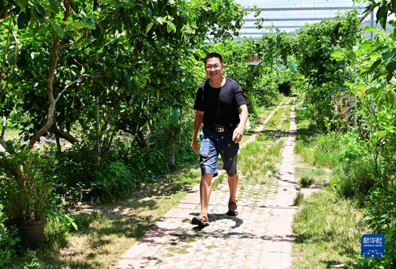 7月11日,在位于廈門市翔安區(qū)的榮杰園觀光農(nóng)場,農(nóng)場負(fù)責(zé)人、臺(tái)胞宋志平在查看水果園的果樹長勢。