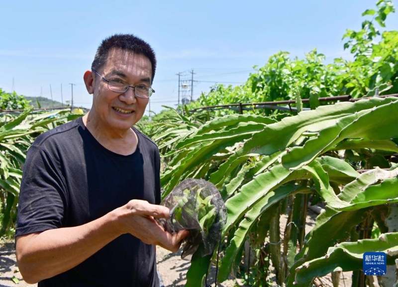 7月11日,在位于廈門市翔安區(qū)的榮杰園觀光農(nóng)場,農(nóng)場負(fù)責(zé)人、臺(tái)胞宋志平在查看火龍果長勢。