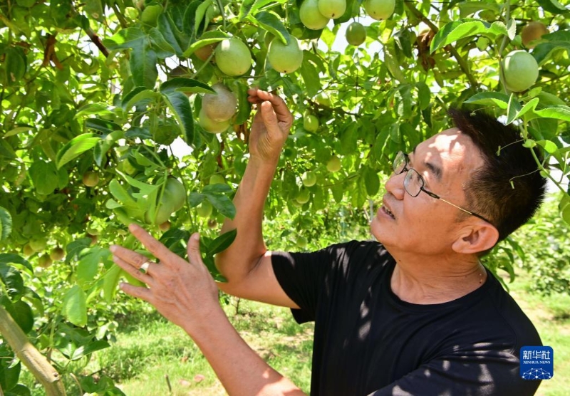 7月11日,在位于廈門市翔安區(qū)的榮杰園觀光農(nóng)場,農(nóng)場負(fù)責(zé)人、臺(tái)胞宋志平在查看百香果長勢。