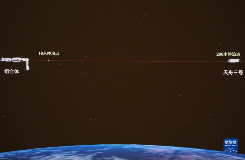 7月17日在北京航天飛行控制中心拍攝的天舟三號(hào)貨運(yùn)飛船撤離空間站組合體圖像。這是天舟三號(hào)貨運(yùn)飛船撤離至200米停泊點(diǎn)的模擬圖像。新華社記者 郭中正 攝