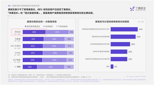 在醫(yī)美項目和家用美容儀的使用關聯(lián)上,《報告》顯示45%的熱瑪吉用戶已經購買了美容儀,且“效果互補”和“延長醫(yī)美效果”是醫(yī)美消費者堅持使用家用美容儀的主要動因。