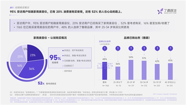 在家用美容儀認知方面,95%受訪用戶知曉家用美容儀,并且已有20%消費者購買使用,52%考慮購買。而在已購人群中,48%的人都選了雅萌品牌,其中25-34歲購買比例高。