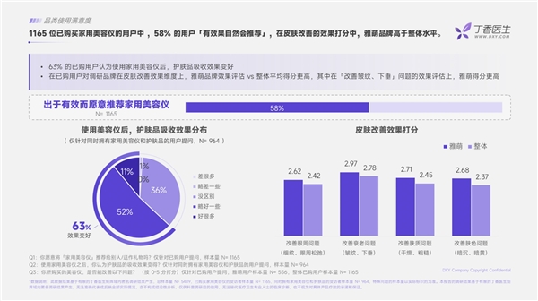 在品類使用滿意度方面,63%的已購用戶認為使用家用美容儀后,護膚品吸收效果變好;58%的用戶出于有效愿意推薦家用美容儀,在已購用戶對調研品牌在皮膚改善效果評分上,雅萌vs整體平均得分更高,其中在【改善皺紋、下垂】問題的效果評估上,雅萌得分更高。