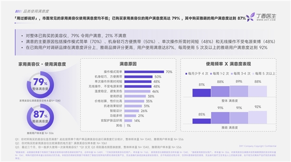 在已購買家用美容儀的調研用戶中,整體滿意度高達79%;在已購用戶對調研品牌的滿意度評分上,雅萌品牌評分更高,用戶滿意度達到87%,且每周使用5次及以上的雅萌用戶滿意度達到92%。