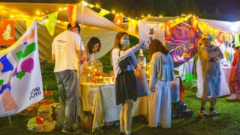 音樂節(jié)還未開始,演出現(xiàn)場創(chuàng)意十足的草原露營集市就人氣滿滿。破爛小龍蝦、鐵板燒、小熊泡椒鳳爪、麻辣鮮香缽缽雞、清涼可口冰粉等美食聚集,呆萌氣球、一瓢工坊、落蒙部、知希海納、非遺纏花、調酒教學、冥想瑜伽、汲露草堂等特色體驗,吸引不少游客前往品嘗美食、體驗原創(chuàng)手工藝、感受非遺文化,開啟草原“逛吃逛吃”模式。