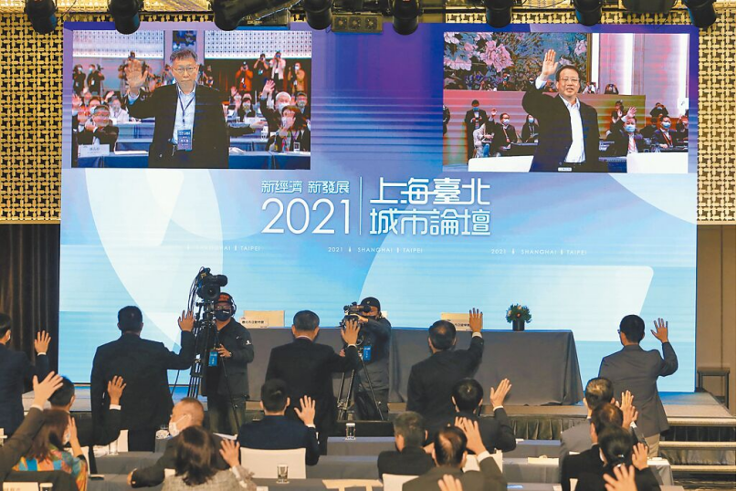 2022年上海臺(tái)北雙城論壇19日以視訊方式登場(chǎng),將簽訂3項(xiàng)合作備忘錄(MOU)。此次未規(guī)劃分論壇,時(shí)程僅1個(gè)小時(shí),為歷屆雙城論壇規(guī)模最小的一場(chǎng)。圖為去年上海市長(zhǎng)龔正(右上)和臺(tái)北市長(zhǎng)柯文哲(左上)在論壇開幕后共同致詞。中新社