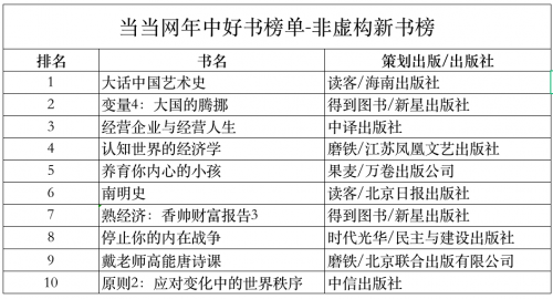 非虛構(gòu)新書榜TOP10中,一半席位被投資理財(cái)和經(jīng)管類圖書占據(jù)。兩本心理學(xué)圖書上榜,藝術(shù)、文學(xué)、歷史類圖書各據(jù)一席??v觀整體榜單,自媒體、大V、達(dá)人產(chǎn)出優(yōu)質(zhì)內(nèi)容,在忠實(shí)用戶的擁躉之下,進(jìn)軍圖書出版領(lǐng)域自然水到渠成。如:讀客與藝術(shù)頭部自媒體意外藝術(shù)合作的《大話中國藝術(shù)史》;得到出品的《變量4:大國的騰挪》《熟經(jīng)濟(jì):香帥財(cái)富報(bào)告3》;磨鐵與千萬級(jí)財(cái)經(jīng)大V珍大戶策劃的《認(rèn)知世界的經(jīng)濟(jì)學(xué)》,都是自媒體與圖書公司深度介入的代表之作?!赌厦魇贰纷鳛槲ㄒ蝗氚竦臍v史類圖書,可謂當(dāng)當(dāng)好書復(fù)活的經(jīng)典案例。這本書最早出版于2003年,面世至今近20年,作者為中國明史研究大家顧誠。在當(dāng)當(dāng)看來,《南明史》作為明史研究的扛鼎之作,不應(yīng)在史海鉤沉中被湮沒。在該書版權(quán)歸屬讀客后,當(dāng)當(dāng)與其深度溝通,在世界讀書日前期推出平裝本上市,實(shí)現(xiàn)了銷售3萬冊的記錄。雖然此前已銷售多年,但該書的受眾是具備較高認(rèn)知水平的群體,調(diào)整產(chǎn)品形態(tài)后,《南明史》仍然有較大空間作為學(xué)術(shù)大眾化的經(jīng)典案例推向市場。在好書復(fù)活這條道路上,當(dāng)當(dāng)仍然保有信心和初心。