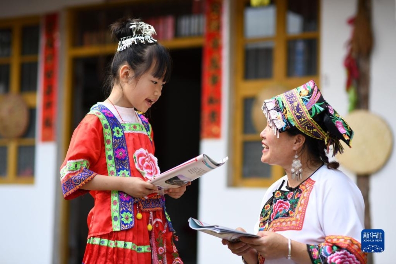 7月19日,湖南省邵陽(yáng)市城步苗族自治縣長(zhǎng)安營(yíng)鎮(zhèn)民族文化傳播服務(wù)中心,一名小朋友在向“六月六”山歌節(jié)市級(jí)傳承人陳巖花(右)學(xué)習(xí)唱山歌。