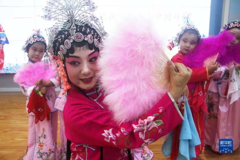7月20日,在河北省唐山市豐潤(rùn)區(qū)太平路街道同慶社區(qū),戲曲老師指導(dǎo)小朋友練習(xí)戲曲動(dòng)作。