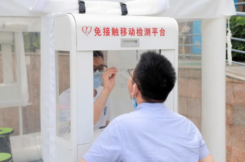 新型免接觸移動檢測平臺,能夠快速縮放成一個拉桿箱,便于設(shè)備快速轉(zhuǎn)移、移動和布置,也可根據(jù)實際場景需要,快速匹配專用帳篷或醫(yī)院固定檢測窗口開展工作。采用一次性可更換檢測薄膜,每臺檢測平臺一次匹配500張薄膜,一次更換可高效完成500人的核酸采樣任務(wù)。檢測平臺具備智能消毒功能,實現(xiàn)一人一膜自動更換,安全衛(wèi)生無污染,具有安全、便捷、高效的優(yōu)點。減少了醫(yī)務(wù)人員反復(fù)按壓搓手和懸臂的勞累,同時還設(shè)置了智能物理性薄膜自動開閉,完全避免了醫(yī)務(wù)人員與被檢測者之間的雙向接觸感染的高風(fēng)險,提供一個安全無菌的采樣空間。它可以適用于各種傳染病的應(yīng)急檢測,在應(yīng)對突發(fā)公共衛(wèi)生安全事件時,助力國家單位、社會組織、企業(yè)在各類突發(fā)設(shè)置的場景,如集中隔離點、學(xué)校、廣場、社區(qū)、企業(yè)內(nèi)、偏遠山區(qū)等,高效安全的迅速展開檢測工作。
