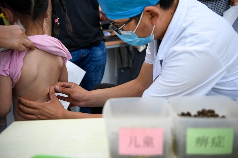 2021年7月11日,寧夏中醫(yī)醫(yī)院暨中醫(yī)研究院治未病中心醫(yī)師在為小朋友貼三伏貼。新華社記者 馮開華 攝