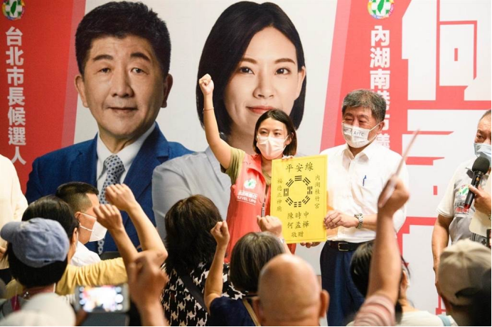 陳時中與民進黨內湖南港區(qū)市議員參選人何孟樺同臺,到桂竹宮參拜。(何孟樺辦公室提供/圖片來源:臺灣《中國時報》)