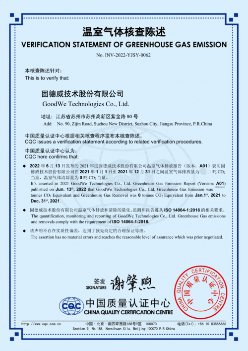 2022年7月,固德威獲得由中國質(zhì)量認(rèn)證中心的雙料認(rèn)證,對其頒發(fā)產(chǎn)品碳足跡認(rèn)證書及溫室氣體核查陳述認(rèn)證證書,固德威不僅為客戶提供智慧零碳解決方案,其自身也在不斷踐行綠色發(fā)展理念,充分體現(xiàn)了固德威作為一家大企業(yè)在綠色時代中的決心和擔(dān)當(dāng)。