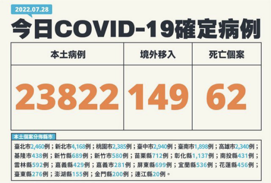 “流行疫情指揮中心”表示,昨日新增之23822例本土病例,為11056例男性、12757例女性、9例調查中,年齡介于未滿5歲至90多歲以上,個案分布為新北市(4168例),臺中市(2940例),臺北市(2460例),桃園市(2385例),高雄市(2340例),臺南市(1898例),彰化縣(1137例),苗栗縣(712例),屏東縣(699例),新竹縣(689例),云林縣(592例),新竹市(580例),宜蘭縣(536例),花蓮縣(456例),基隆市(438例),南投縣(431例),嘉義縣(429例),嘉義市(281例),臺東縣(276例),金門縣(200例),澎湖縣(155例),連江縣(20例)。