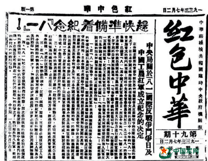 1933年7月2日,《紅色中華》刊載《中央局關(guān)于“八一”國際反戰(zhàn)爭斗爭日及中國工農(nóng)紅軍成立紀念的決定》。