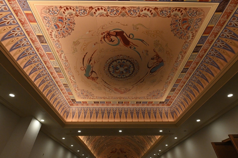 雖然洞庫(kù)區(qū)域不對(duì)外開放,但我們依然可以從負(fù)責(zé)繪制洞庫(kù)壁畫的,敦煌研究院美術(shù)研究所研究員婁婕口中,感受到這份來(lái)自東方美學(xué)的獨(dú)特韻味:“我們?cè)谔祉數(shù)睦L制上選取了敦煌壁畫中最有代表性的飛天形象主題,四周也有流動(dòng)的天花。在飛天的部分,有手持的樂(lè)器,還有不鼓自鳴的樂(lè)器,箜篌、鼓等等,都在周邊飛揚(yáng),表現(xiàn)出了靈動(dòng)飄逸的畫面意象,非常具有東方美學(xué)的審美特質(zhì)、浪漫特質(zhì)。”