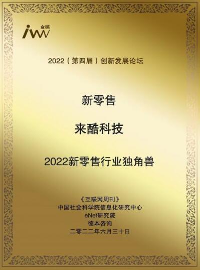 在2022年6月的“2022(第四屆)創(chuàng)新發(fā)展論壇”上,來酷科技當(dāng)仁不讓地?cái)孬@2022年新零售行業(yè)獨(dú)角獸榮譽(yù)。這既是數(shù)字化領(lǐng)域權(quán)威研究機(jī)構(gòu)和主流媒體對(duì)來酷科技推動(dòng)新零售行業(yè)實(shí)現(xiàn)智慧升級(jí)成果和貢獻(xiàn)的高度認(rèn)可,也是對(duì)來酷科技創(chuàng)新理念和卓越業(yè)績(jī)的肯定和激勵(lì)。