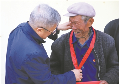 在云南省會澤縣寶云街道土城社區(qū)陳家村,慰問人員為參戰(zhàn)退役軍人王啟堂佩戴紀念章。歐陽治民攝