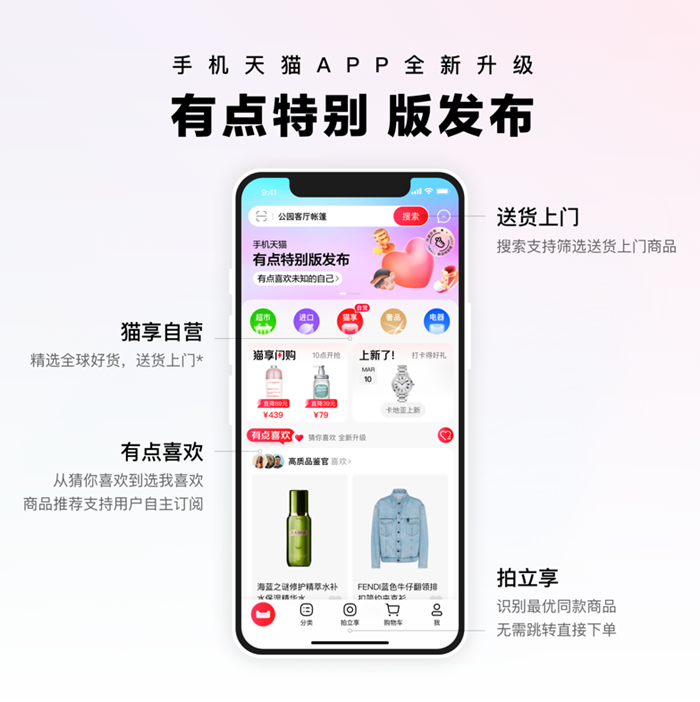 8月4日,手機(jī)天貓App全新升級,發(fā)布“有點(diǎn)特別版”,新版App首頁采用當(dāng)下流行的極簡風(fēng),商品推薦不再“猜你喜歡”,用戶可自主訂閱興趣標(biāo)簽;升級后“拍立享”拍圖找貨功能,從推薦多款到只推薦最優(yōu)一款;同時,搜索支持篩選送貨上門商品,圍繞用戶體驗全面升級。