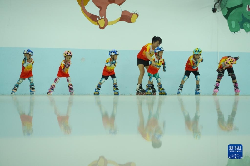 8月8日,小朋友在河北省邢臺(tái)市內(nèi)丘縣一家輪滑俱樂(lè)部參加輪滑訓(xùn)練。