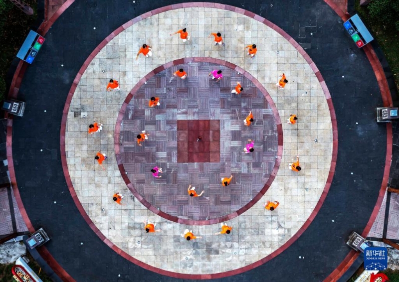 8月8日,市民在貴州省黔西市濱河灣廣場(chǎng)進(jìn)行健身運(yùn)動(dòng)(無(wú)人機(jī)照片)。