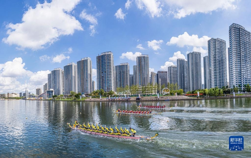 8月8日,在浙江省溫州龍舟運(yùn)動(dòng)中心,選手們駕著龍舟在500米直道賽中角逐(無(wú)人機(jī)照片)。