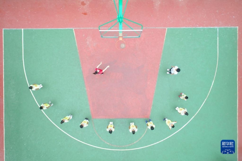 8月8日,在河北省唐山市豐潤(rùn)區(qū),教練在指導(dǎo)小朋友練習(xí)籃球基本動(dòng)作(無(wú)人機(jī)照片)。