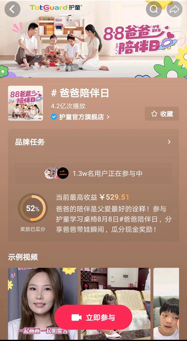 近日,兒童學(xué)習(xí)桌椅品牌護童科技在抖音平臺發(fā)起了#爸爸陪伴日全民任務(wù),圍繞"爸爸帶娃的N次方",引導(dǎo)大家以短視頻的形式記錄爸爸帶娃的日常。參與挑戰(zhàn)賽的優(yōu)質(zhì)視頻內(nèi)容,通過系統(tǒng)評判,還能獲得官方現(xiàn)金紅包獎勵。