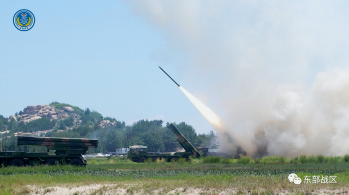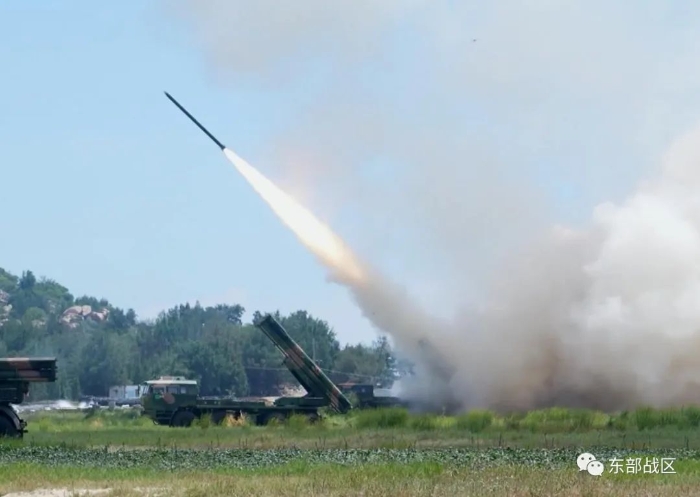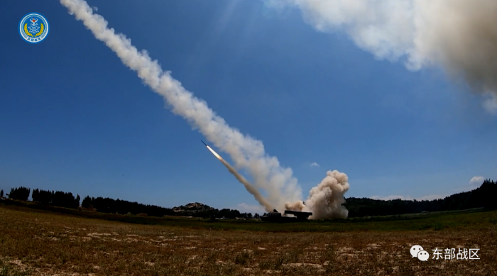 長纓呼嘯刺天際,戰(zhàn)神怒吼震蒼穹。戰(zhàn)區(qū)陸軍依令對臺灣海峽東部特定區(qū)域進行精確打擊,遠程火箭彈噴射烈焰直撲海面,打擊取得預(yù)期效果。