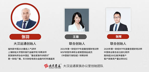 大漢運(yùn)通創(chuàng)始團(tuán)隊(duì)及合作講師,集聚來(lái)自全國(guó)的頂級(jí)金融、科技、法律、稅務(wù)等專家,多位曾任職于世界500強(qiáng)金融企業(yè),均為前高管及資深人士。公司創(chuàng)始人張羽是福布斯中國(guó)2019最佳人氣講師,聯(lián)合創(chuàng)始人王蓓、張暉分別榮獲2021及2020年第一財(cái)經(jīng)RFP年度最佳理財(cái)培訓(xùn)師。