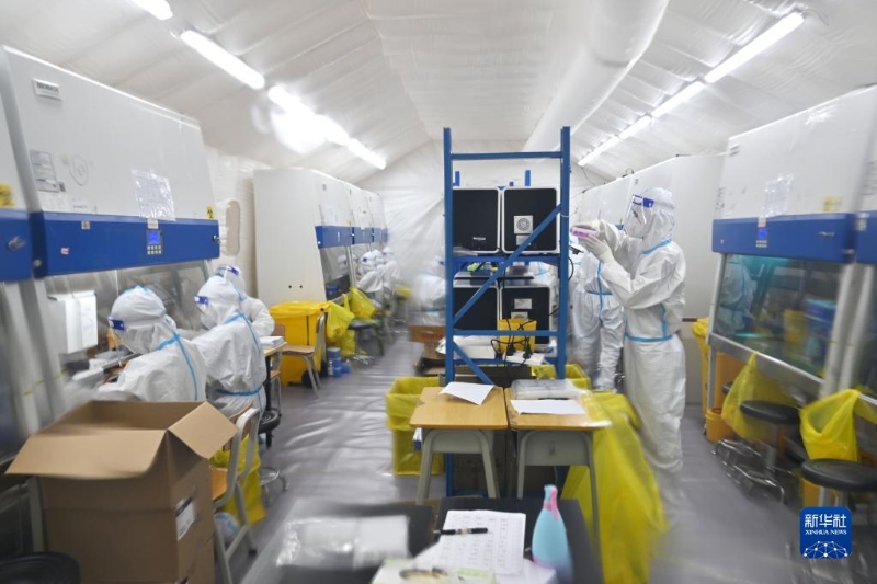 8月11日拍攝的由廣東省援海南三亞核酸檢測隊搭建的氣膜核酸檢測實驗室。