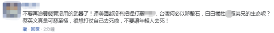 “不要再浪費(fèi)錢買沒用的武器了!”有網(wǎng)友認(rèn)為,連美國都沒有把握打贏大陸,臺灣何必以卵擊石,白白犧牲臺軍弟兄的生命呢?該網(wǎng)友痛批蔡英文可惡至極,“很想打仗自己去死啦,不要讓年輕人去死!”