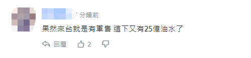本月2日,美眾議院議長佩洛西不顧中方警告,堅持竄訪中國臺灣地區(qū)。在臺美簽署總價約25.2億元新臺幣合約的消息傳出后,有網(wǎng)友表示,“果然來臺就是有軍售,這下又有25億油水了。”