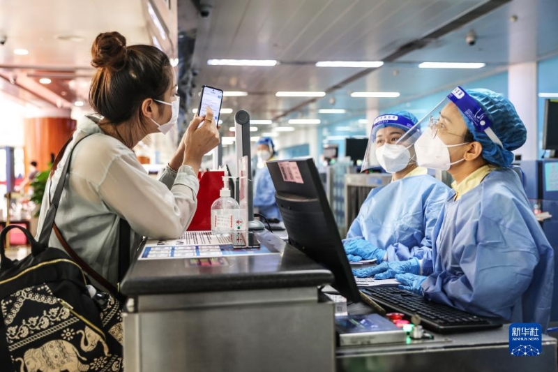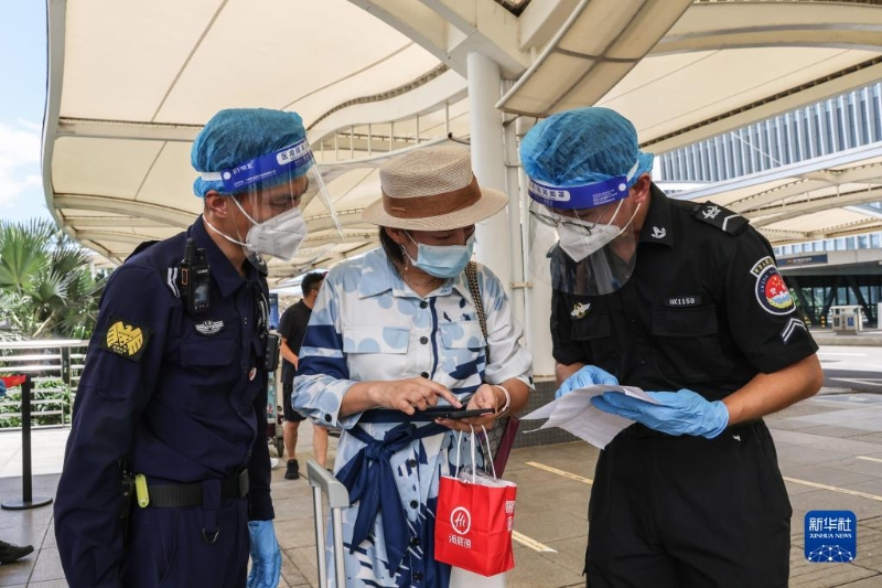 8月14日,??诿捞m機(jī)場的工作人員查驗(yàn)旅客的核酸信息。