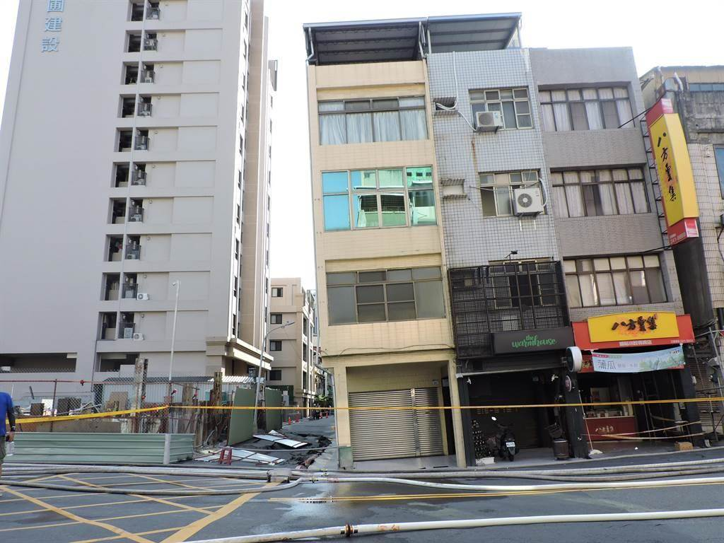 高雄市前金區(qū)自強一路83巷一處建案工地14日塌陷意外,附近住戶和商家急撤離,不僅路面出現(xiàn)多道裂痕,就連一旁的住家也都嚴重傾斜。(洪靖宜攝)
