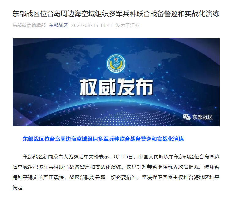 東部戰(zhàn)區(qū)新聞發(fā)言人施毅陸軍大校表示,8月15日,中國人民解放軍東部戰(zhàn)區(qū)位臺島周邊海空域組織多軍兵種聯(lián)合戰(zhàn)備警巡和實戰(zhàn)化演練。這是針對美臺繼續(xù)玩弄政治把戲、破壞臺海和平穩(wěn)定的嚴正震懾。戰(zhàn)區(qū)部隊將采取一切必要措施,堅決捍衛(wèi)國家主權和臺海地區(qū)和平穩(wěn)定?! ?/p>