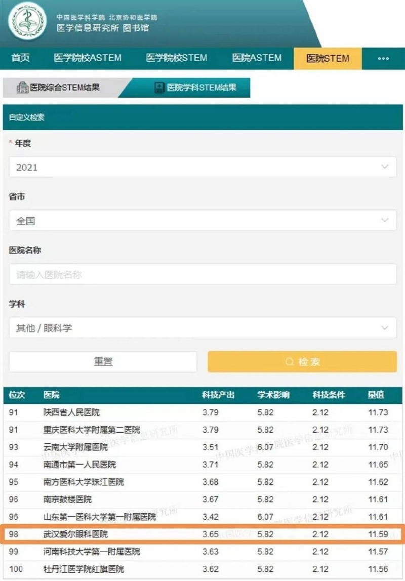 2022年8月4日,由中國(guó)醫(yī)學(xué)科學(xué)院主辦的2021年度中國(guó)醫(yī)學(xué)院校/中國(guó)醫(yī)院科技量值(STEM)暨五年總科技量值(ASTEM)發(fā)布。武漢愛(ài)爾眼科醫(yī)院(湖北總院)榮登眼科學(xué)榜第98位。