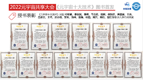 在授書表彰環(huán)節(jié),元宇宙產(chǎn)業(yè)委為作者、成果人、案例單位和出版編輯頒發(fā)證書及圖書紀(jì)念相框,為圖書腰封定制單位授書。包括葉毓睿、李安民、李暉、岑志科、何超、蔡恒進(jìn)、黃朝波、王濤、高承實(shí)、王峰、遲小羽、梁棟、甄琦、張烽、杜彪、周兵、周倩、劉佳玉等18人獲得成果獎(jiǎng)。